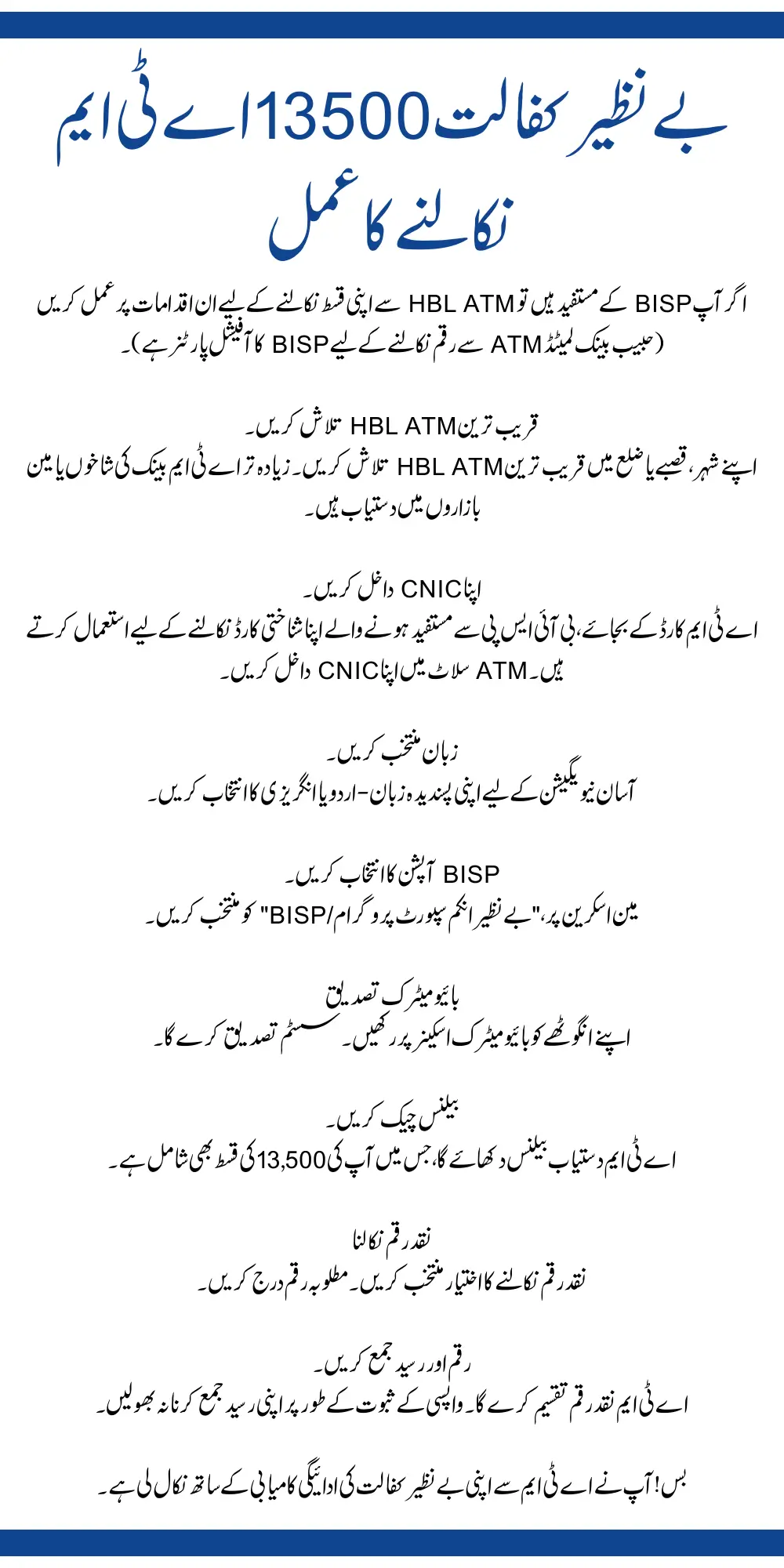 If you are a BISP beneficiary, follow these steps to withdraw your installment from an HBL ATM (Habib Bank Limited is the official partner of BISP for ATM withdrawals).